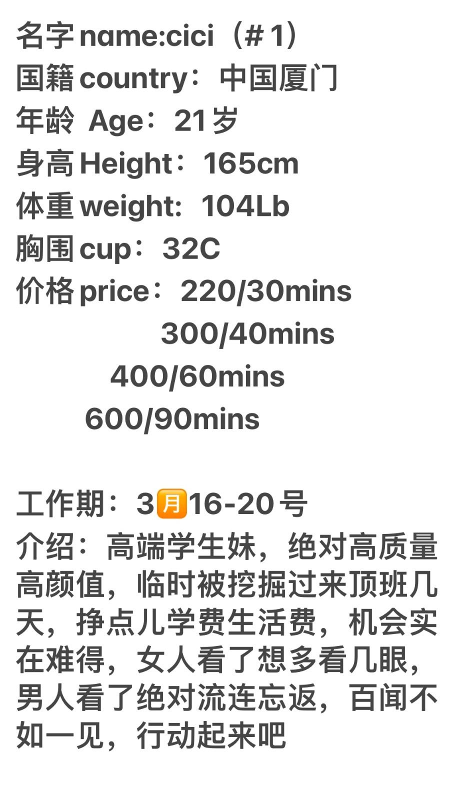 Posted: Mar 17 16:54:08 2023Number 1 girl, CiCi,super beautiful top quality girl, part time only, 100% guaranteed upscale girl for 400 hourly. You don’t want to miss her.