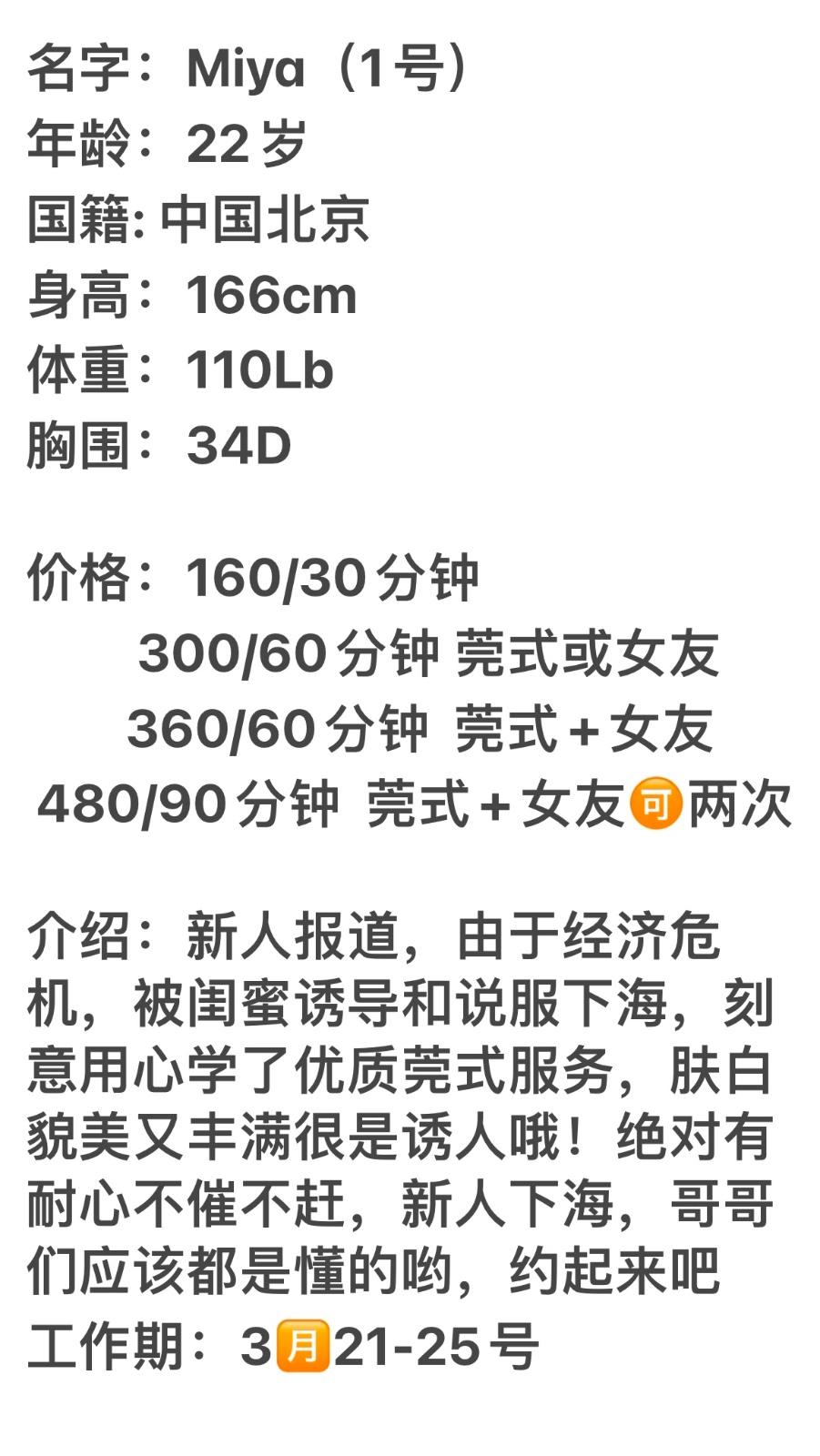 Posted: Mar 26 15:47:01 2023Number 1 girl, Miya, fresh new starter from Beijing,curvy body with white skins.