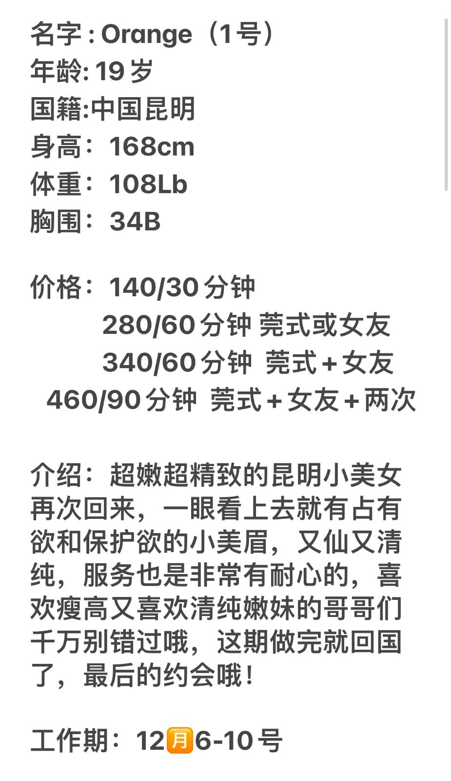 Posted: Dec 6 15:40:54 2022Number 1 girl,Orange,super young Chinese,innocent first love experience,Gfe and DG services.