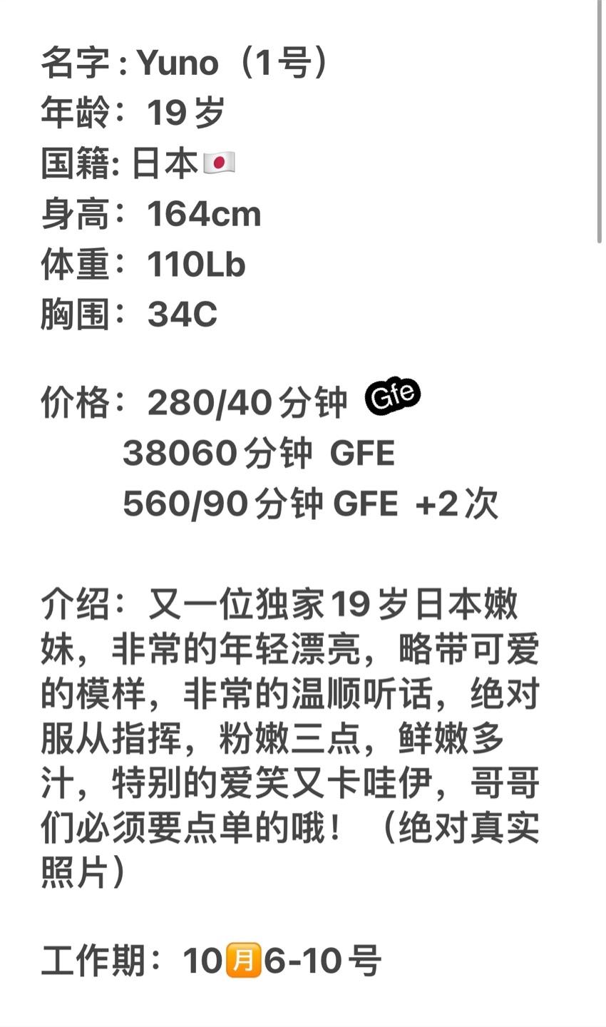 Posted: Oct 6 15:59:56 2022Number 1 girl,Yuno,guaranteed true Japanese girl,super young 19 yrs old only, cute and beautiful rare Japanese you don’t want to miss. 110 lbs,34 C,5'2. Special Japanese Treat with Japanese GFE services.