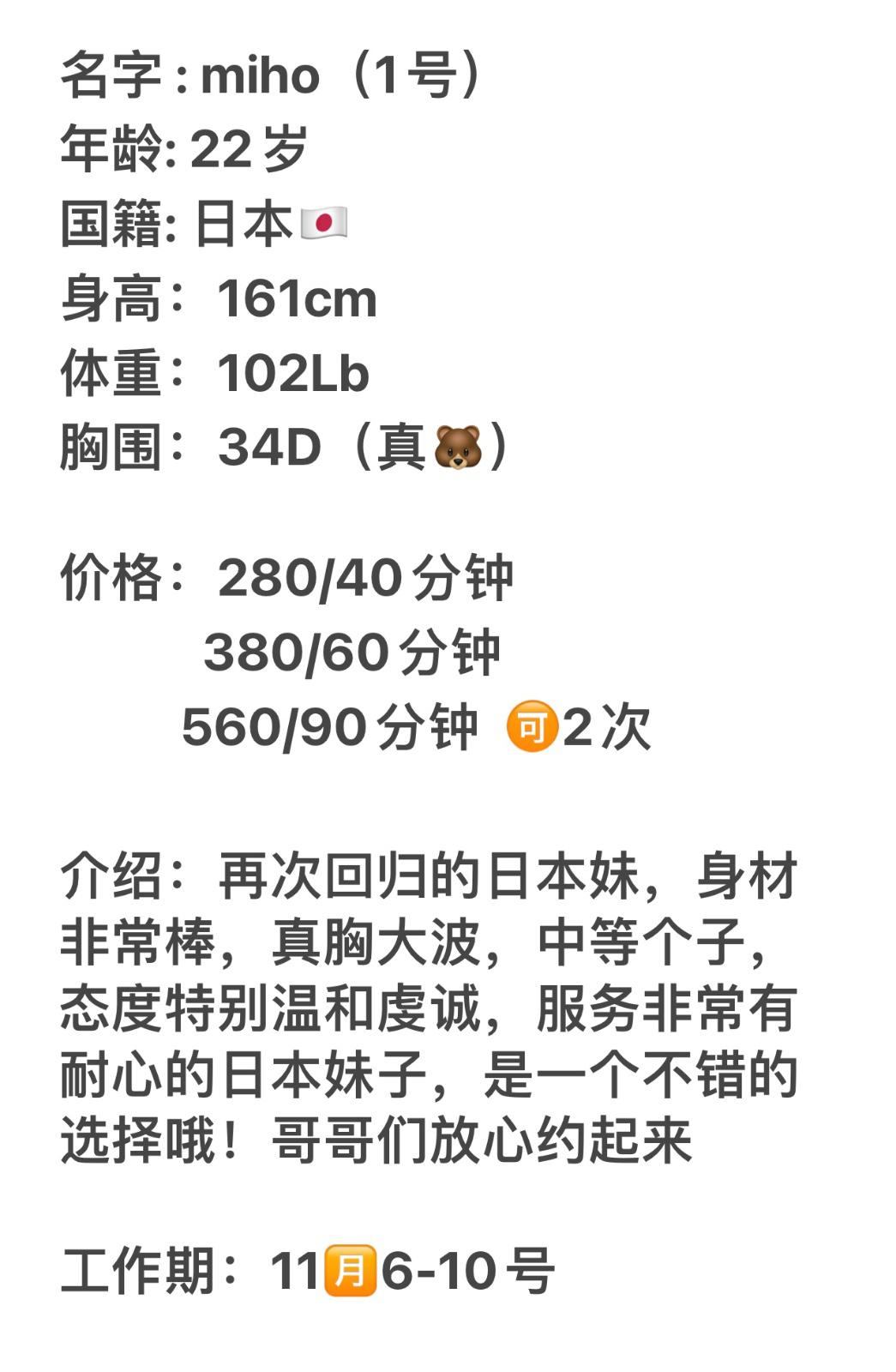 Posted: Nov 9 15:46:57 2022Number 1 girl,Miho,kind gentle Japanese returns for short times,22 yrs old,34D,102 lbs,5’2. 100% guaranteed genuine Japanese girl. Special Japanese service with extra.